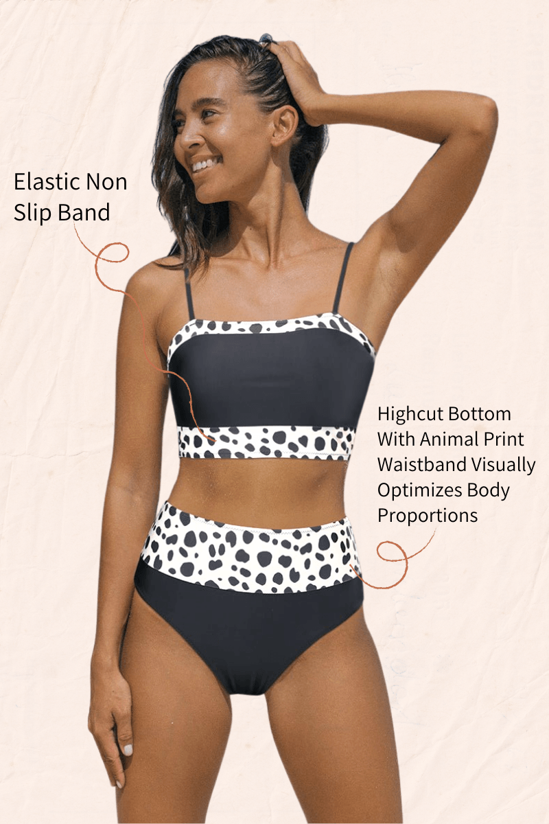 Feel sporty and cute in this Bandeau Leopard Printed Patchwork Bikini Set. Bandeau bikini top matching with our high waisted bikini bottom.
