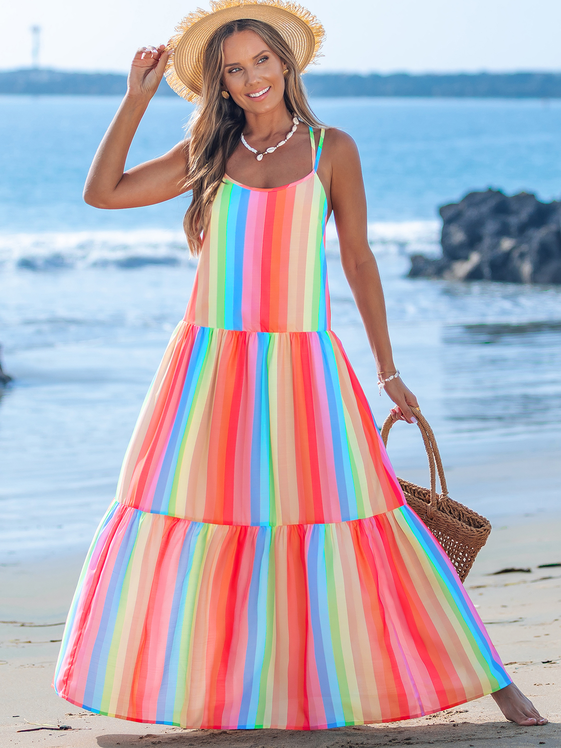 Rainbow Stripe Vacation Crisscross Back Maxi Dress