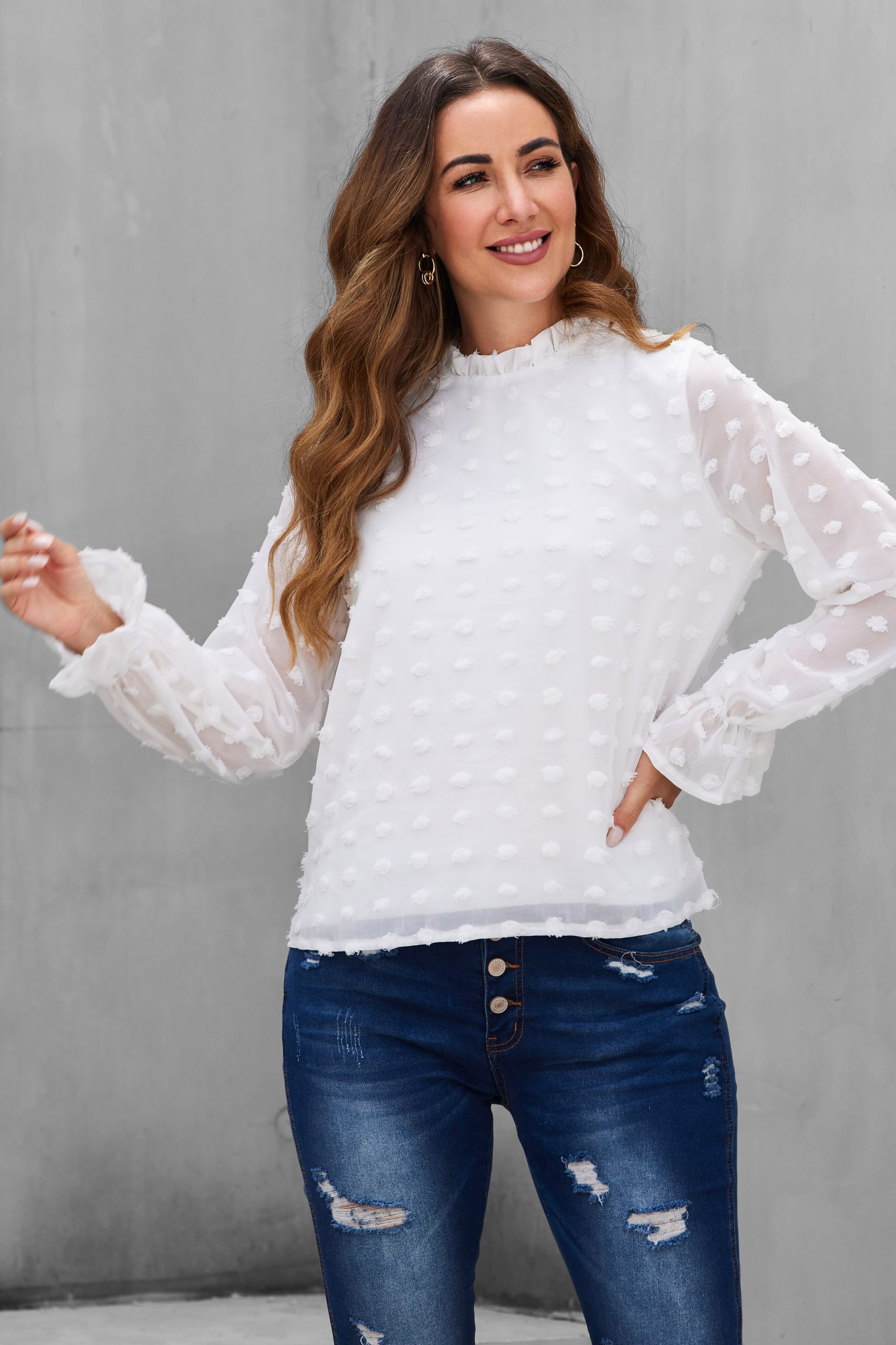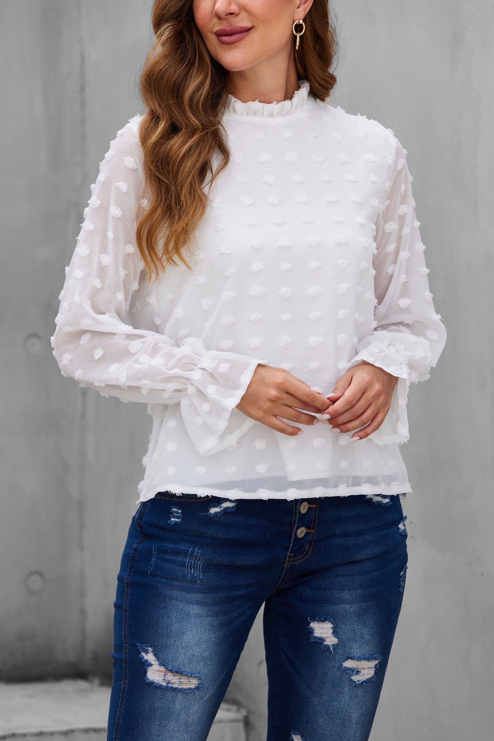 Channel your divine feminine energy in this embroidered top featuring a round neckline, semi-sheer long peasant sleeves with ruffled cuffs. Pair with some espadrille wedges and mom jeans to complete the look.