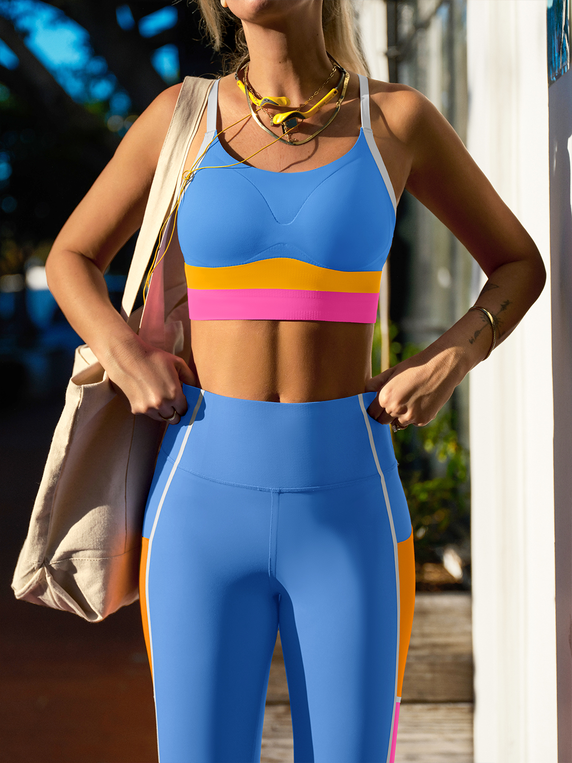 A coordinated bra and legging set designed to sculpt, support, and move with you. Clean bonded finishes and strategic colorblocking create a flattering, streamlined look that feels confident and comfortable from studio to street.