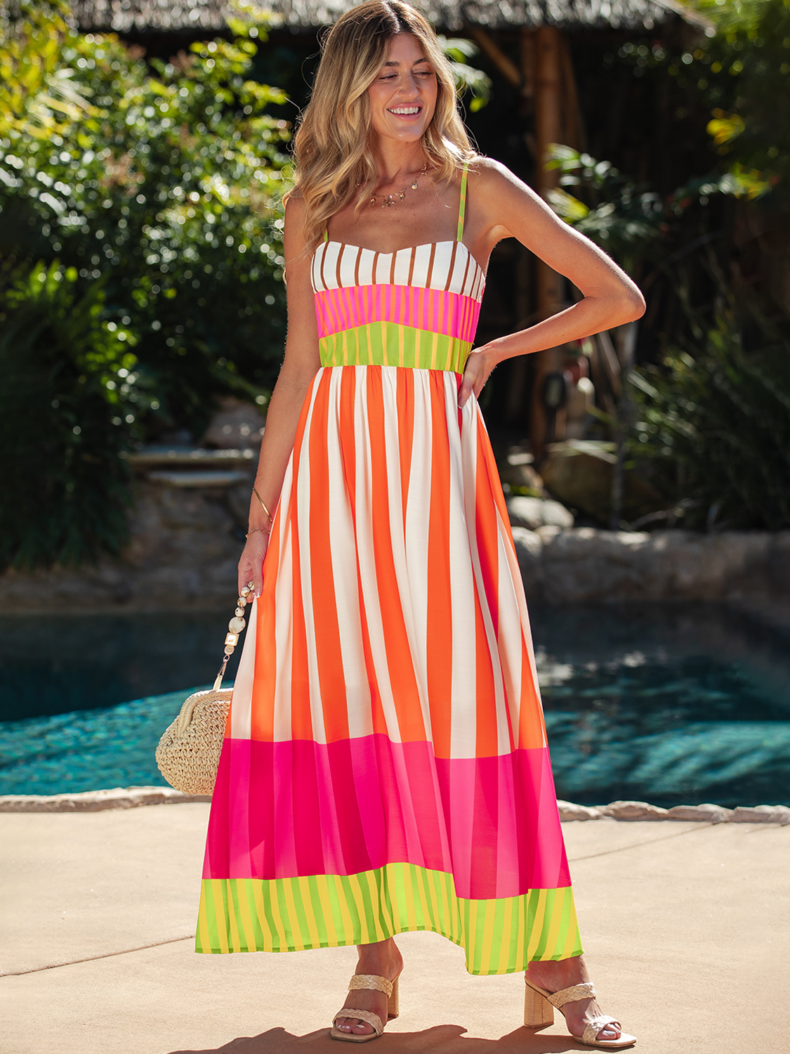 This maxi dress features a defined bodice with vertical stripe placement that creates a lengthened look, while the contrast color-block panels add visual interest without overwhelming the silhouette. Adjustable shoulder straps and a smocked back ensure a flexible, comfortable fit.