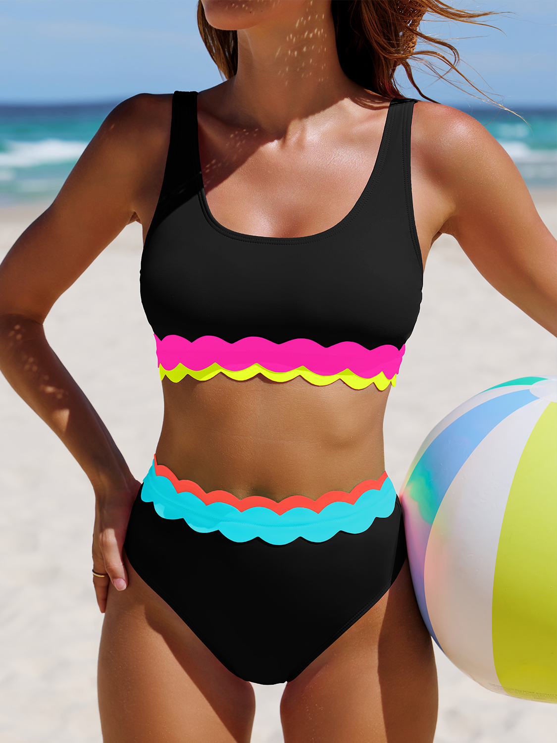 This color-block bikini set features soft scalloped trim for a playful yet balanced look.