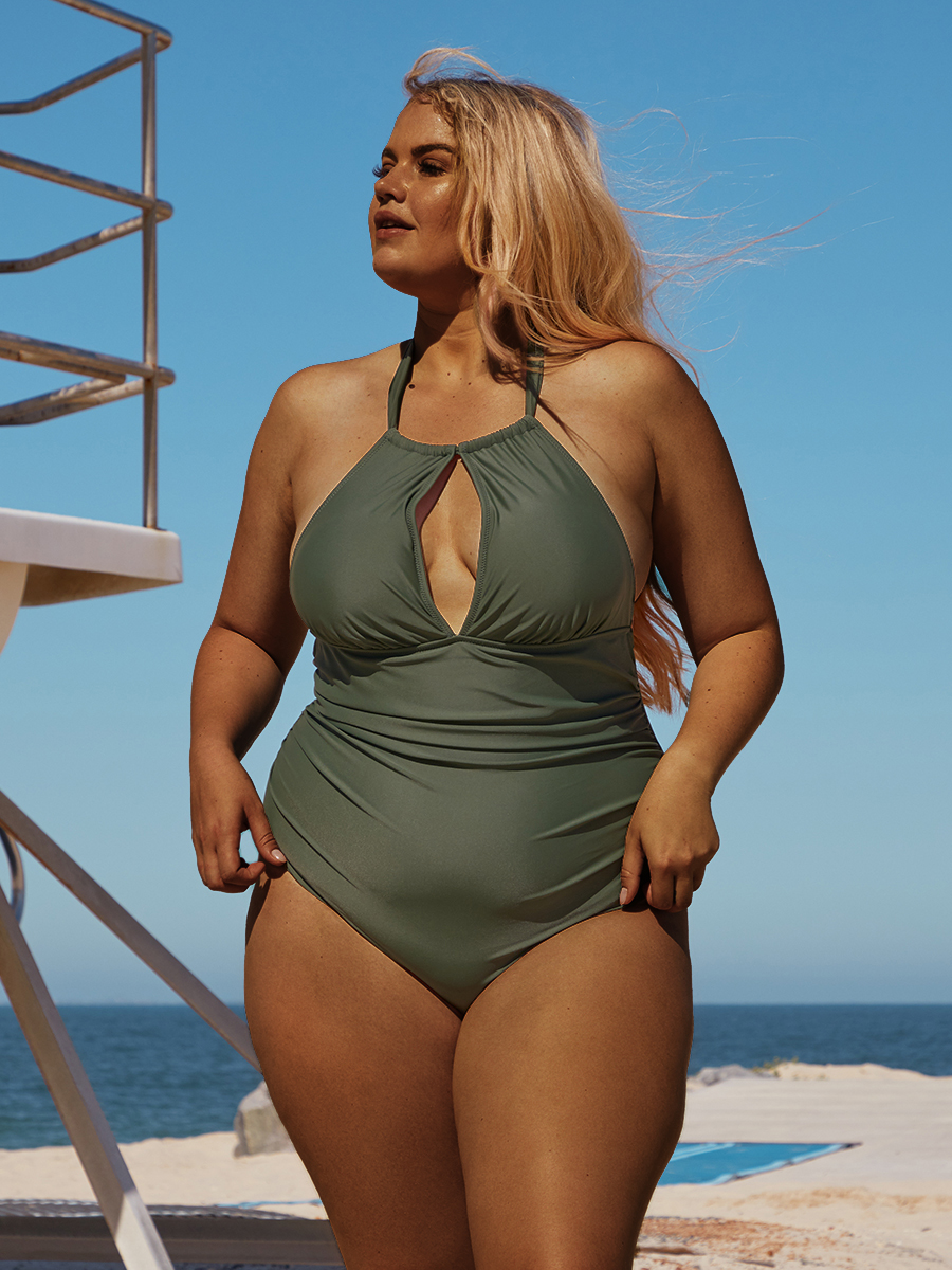 Plus Size Solid Halter Green One Piece Swimsuit